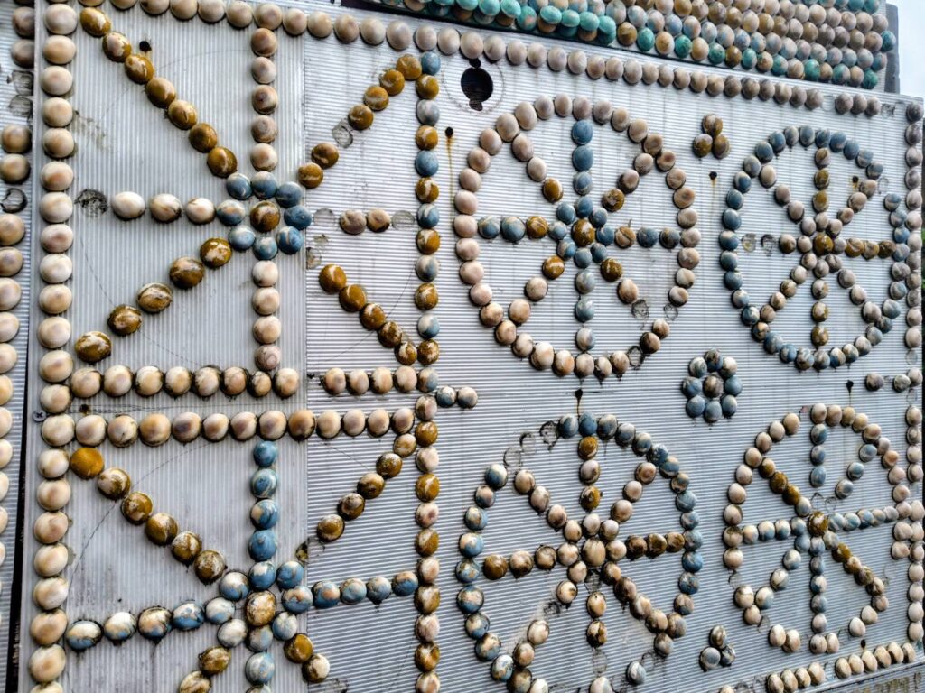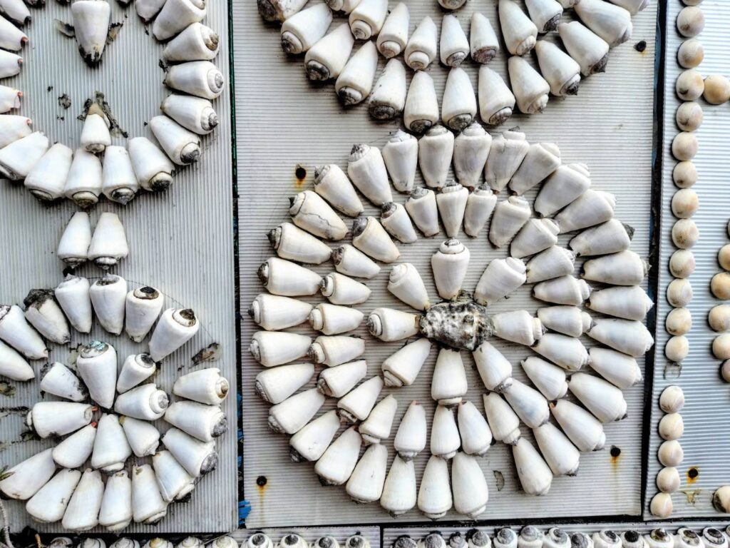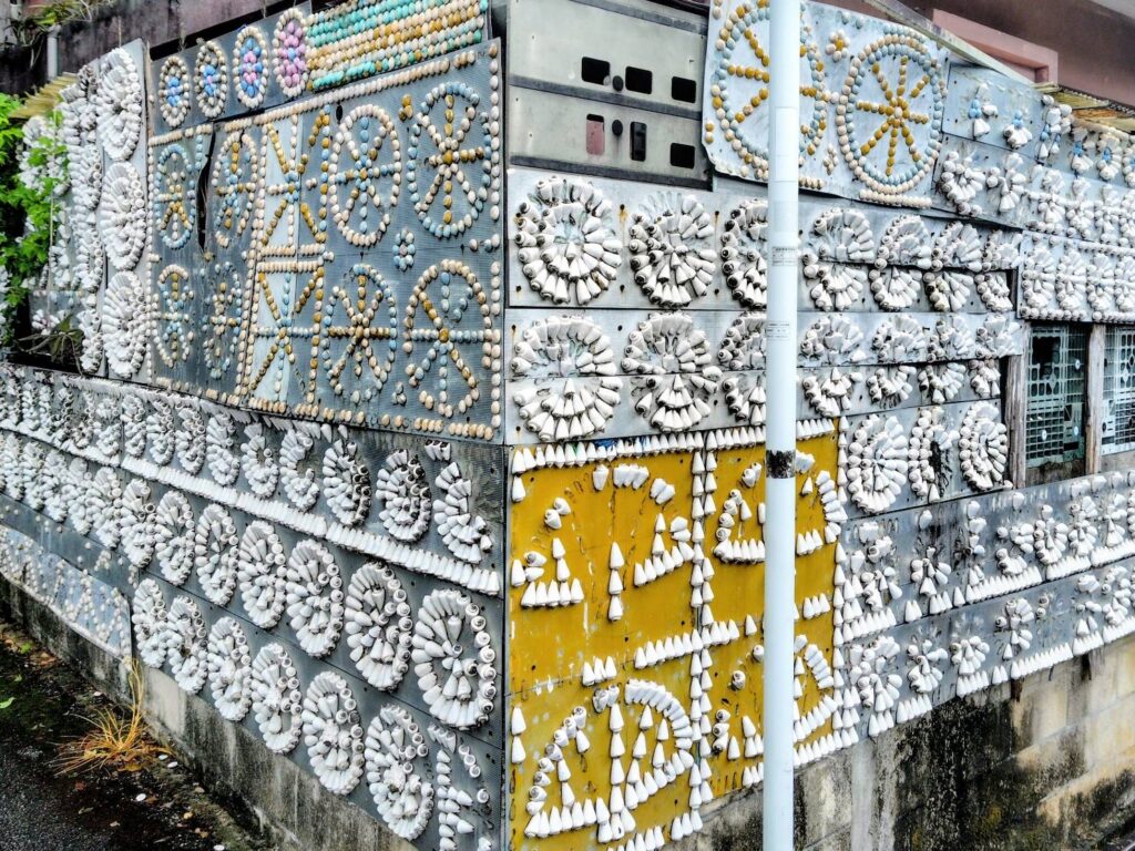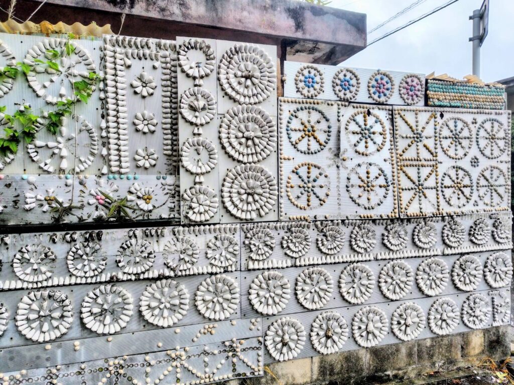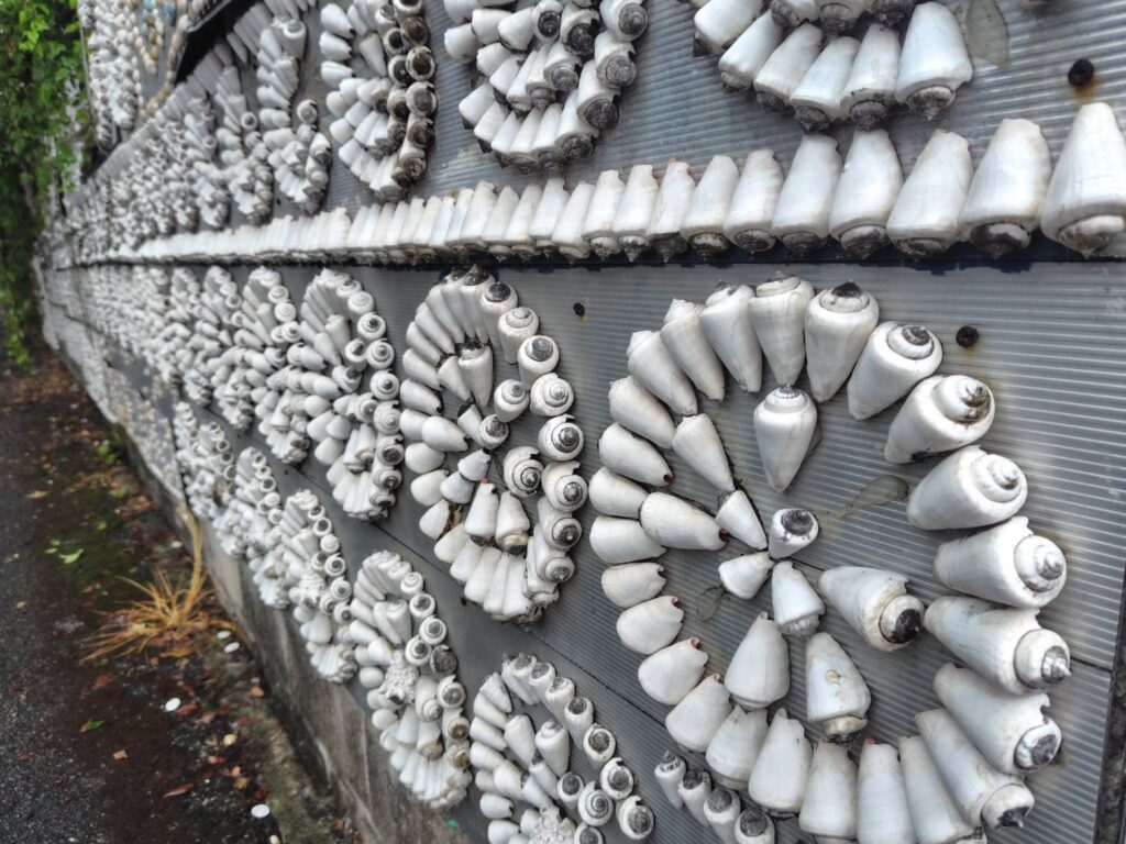 よ〜く見てみると、沢山の貝殻🐚がボードに貼られていて、そのボードが塀にズラ〜っと並んでいるのです。